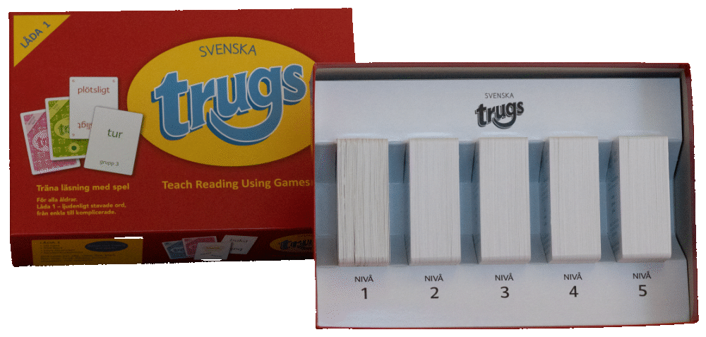 Det populära lässpelet Trugs låda 1 har utökats med fler ord för att passa ännu bättre till det svenska språkets struktur. Börja med Trugs 1 när barnen just har knäckt läskoden. Trugs passar också för alla som behöver förbättra sin läsförmåga för att få ett bättre läsflyt. Spelen är enkla att använda för en gemensam stund med roliga kortspel. De passar lika bra i skolan, på fritids som hemma.